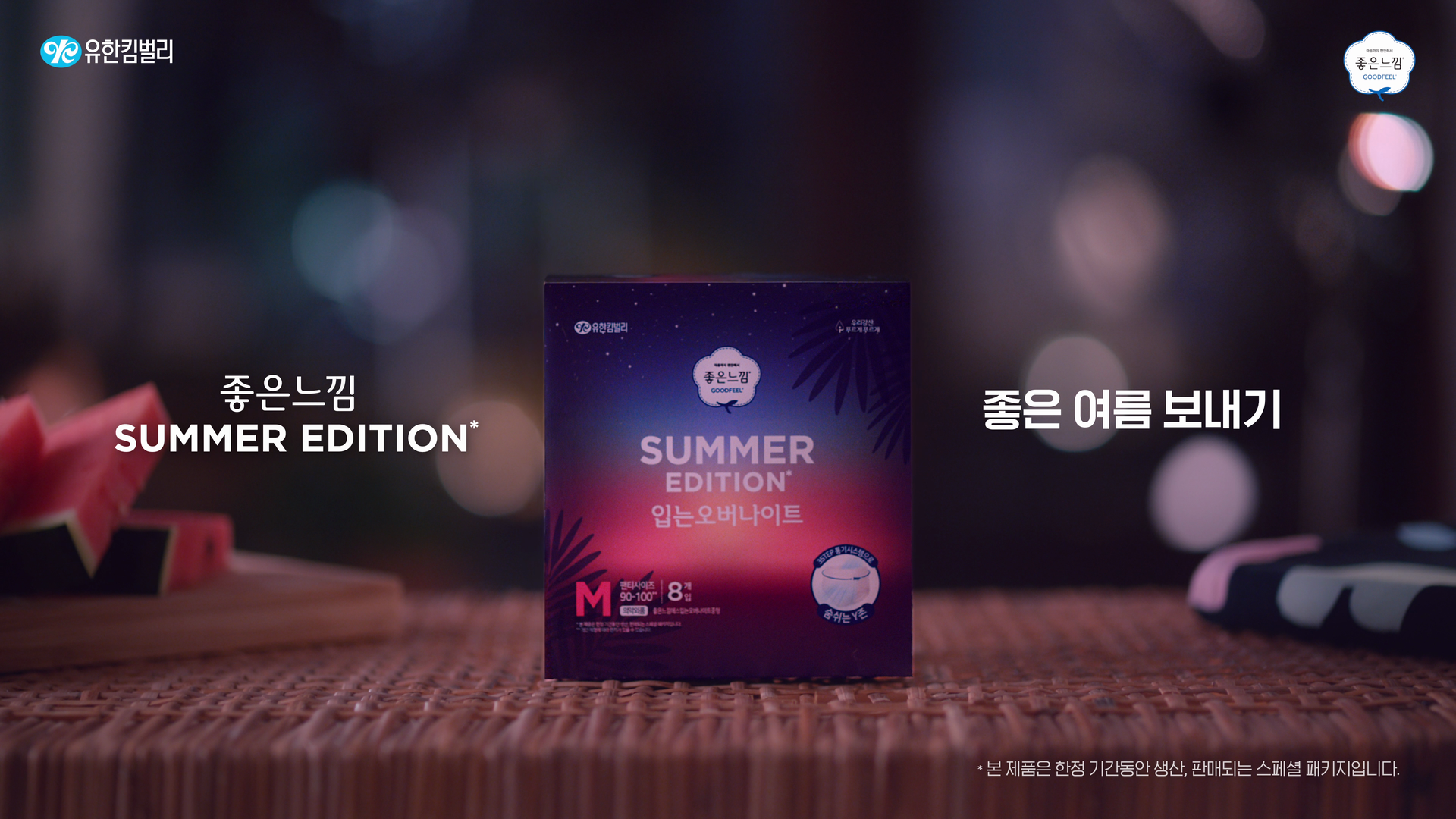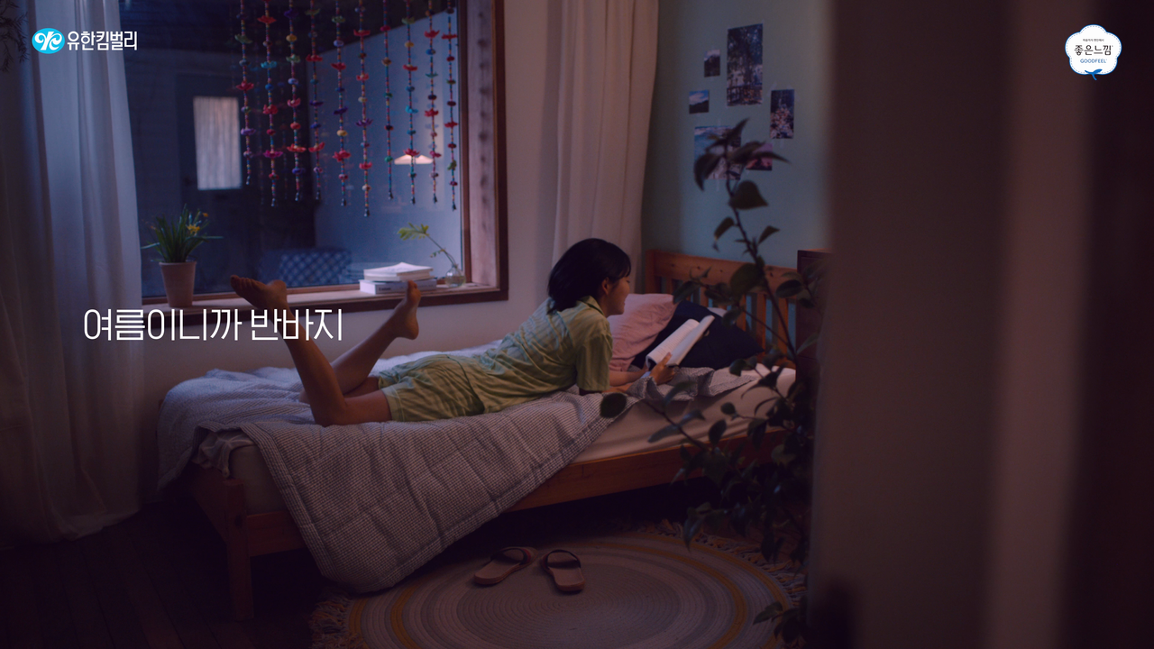유한킴벌리 좋은 느낌의 여름 생리대 신제품 광고를 제작했습니다. 여름을 겨냥한 제품의 특장점이 잘 드러나도록 계절감을 연출했습니다. 여름의 무르익음 속에서 좋은느낌의 브랜드 심볼, 제품 패키지가 조화로울 수 있도록 감각적인 색상을 배치하였고 다양한 송출 환경을 고려하여 3D 와 텍스트그래픽으로 제품의 특장점을 시각적으로 강조했습니다.